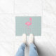 Een doormat met een illustratie van een roze flamingo boven een quatrefolieramolachtergrond. Pas het monogram aan.