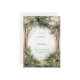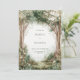 This design features a tranquil, overcast forest scene filled with a sense of quiet mystery. Towering, textured trees with delicate white blossom reach toward a misty, fog-shrouded background, creating a deep and immersive woodland atmosphere. The lush greenery of the forest floor is rendered in soft, painterly tones, all encased within a crisp, double-line gold frame that adds a touch of modern sophistication to the organic scenery. As a wedding invitation, this piece is an ideal choice for a moody woodland ceremony, a refined outdoor spring wedding, or a whimsical fairy-tale celebration. It sets a peaceful and romantic tone, focusing on the natural beauty and enchanting stillness of a hidden forest grove.