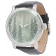 An ethereal and atmospheric digital painting or illustration depicting a dense coniferous forest shrouded in thick mist or fog. The tall, slender pine and evergreen trees create layers of depth, with the foreground trees showing more distinct detail and deeper shades of green, while the trees receding into the background fade into soft, pale, and desaturated hues of sage and grey. The overall mood is calm, mysterious, and tranquil, evoking the feeling of a quiet morning deep in the wilderness.