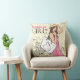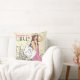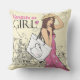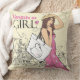 Stijlvolle decoratieve gooikussens met een mode meisje met een tas in schetsstijl op een achtergrond van de stad.