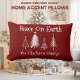 Modern Christmas Family Name Peace On Earth Lumbar Pillow designed with white Christmas trees with gold colored stars on a deep red background. The text reads: Peace On Earth along with your Family Name. The reverse text includes: Merry Christmas. To personalize simply insert your name into our easy template, replacing the sample. Makes a great Christmas gift, or for your home holiday decor.