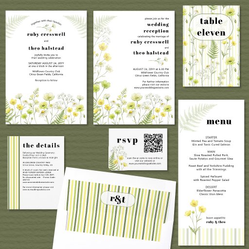 Add a touch of zesty, high-end botanical style to your wedding reception or rehearsal dinner with these elegant napkins from the Citrus Green Wildflower collection. This napkin features a sophisticated design with a beautiful watercolor arc of wildflowers and ferns perfectly framing the names of the bride and groom, displayed in this collection's signature bold serif typography. Grounded by a chic striped border in citrus green and buttercup yellow at the base, it brings a preppy, grandmillennial energy to your table setting. This napkin is perfect for a garden party, country club, or upscale outdoor celebration and can be easily personalized with your names and wedding date for a cohesive, designer look.
