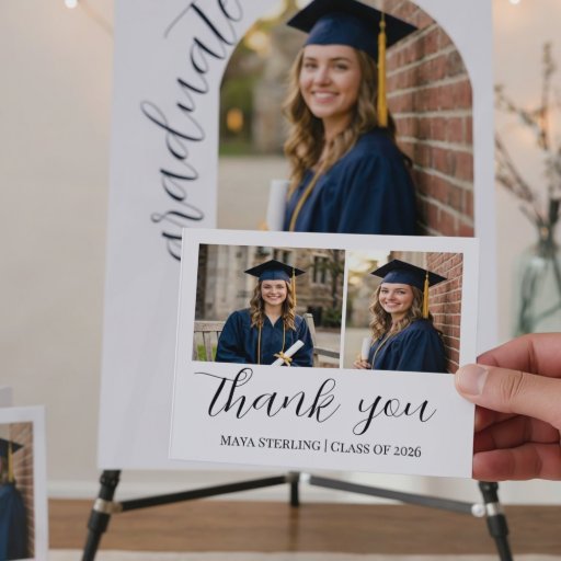 The clean white layout is perfectly balanced with a 3-photo grid, allowing you to showcase multiple senior portraits—from classic graduation cap-and-gown shots to casual campus candids. Personalize the front with your name and class year in our signature all-caps serif typography.