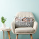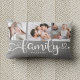 De moderne kussen van de douanefoto collage met ruimte voor 3 foto's die een trendy schemerige manuscript lezen FAMILIE en uw douanenaam hieronder. Dit is de huisversie met grijs bedrukt linnen burlap.