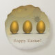 Een abstracte en moderne Pasen-illustratie met drie gouden paaseieren op een boke achtergrond met abstracte bloemen.
