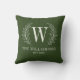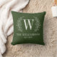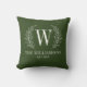 Een modern monogram groen werpkussen met laurierbladeren. Voegt een elegante touch toe aan uw interieur. Personaliseer het met uw Initiaal, naam en trouwdatum. Ontworpen voor u door BlackBerry Boulevard.