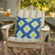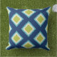Stijlvol en stijlvol vierkant ontwerp met openluchtaccenten biedt een ruitvormig Ikat-stijlpatroon in appelgeel / groen, aqua / turquoise blauw, zacht wit en blauw (de achtergrond kan worden aangepast) kleuren.