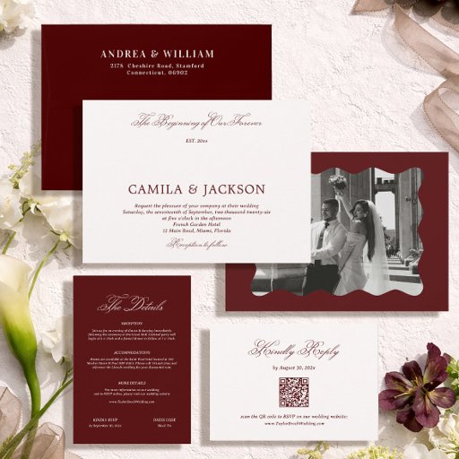 Modern Ivory and Burgundy Wedding RSVP Qr Code Informatiekaartje