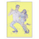 Een kleurenpotlood en penillustratie in een cartoon stijl van een paar in het midden van een moderne jive beweging. Een man met donker krullende haar en een lichte paarse knop onderaan het shirt met de sleeves omhoog, blauwe denim jeans en donkerblauwe schoenen dansen met een mooie jonge vrouw die een donkerblauwe gestreepte jurk en schoenen met hoge hakken draagt. Het meisje heeft een lang stromend donker bruin haar.