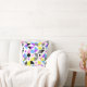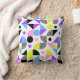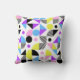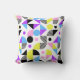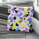 Dit moderne kussen heeft een kleurrijk naadloos geometrisch patroon met lijnen en vormen in geel, blauw, roze, paarse en zwart op een witte achtergrond.