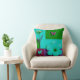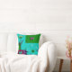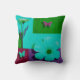 This modern floral pillow showcases oversized pink flowers set against bold, geometric color blocks.