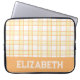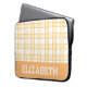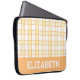 A modern preppy plaid laptop sleeve in pastel orange and yellow, designed with a varsity-style custom name lettering near the bottom edge, giving it an academic vibe. Slip your laptop inside for classes, library study sessions or trips across campus - the protective build and stylish cover make it both practical and pretty. Add your name to make it feel distinctly yours. Thanks for viewing an Eria Daisy Art design!