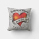 Dit kussen is voorzien van een tattoo stijl hart gekleurd met een oranje en rode fractal ontwerp. Het hart is versierd met een lint banner. Er zijn twee namen hierboven en een datum op de banner voor u om te personaliseren. De tekst hieronder luidt "voor altijd".