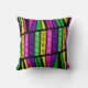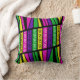 Moderne Retro Multikleurig Sierkussen. Heldergroen, roze, paars en geel, strepen met een cirkelpatroon in het midden.