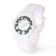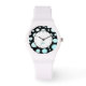 Personaliseer dit moderne leuke en funky retro stijl polka-stippen horloge met een naam of uw eigen tekst binnen de cirkelvormige rand van turquoise blauw en wit gradiënt cirkels op zwart. Dit afbeelding is origineel fotografie door JLW_PHOTOGRAPHY.