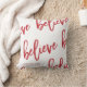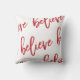Modern rood wit geloof script vakantie kussen functies geloven in rood script op een witte achtergrond.