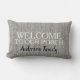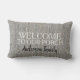 Moderne rustic grijs linenpatroon Welkom bij ons Porch script, familienaam, lumbar kussen.