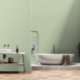 Klein klaverpatroon op lichtere schaduw van salie groene achtergrond voor comfortabele, rustige, en verfrissende moderne interieur