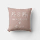 Deze moderne, trendy warme, oortige roze kussen kenmerkt uw achternaam en coole, met de hand geschreven witte script dat "Mr. & Mrs." zegt, samen met een gekrabbeld hart en een vastgelegde datum. Een mooie en elegante bruiloft die perfect past bij elk decor.