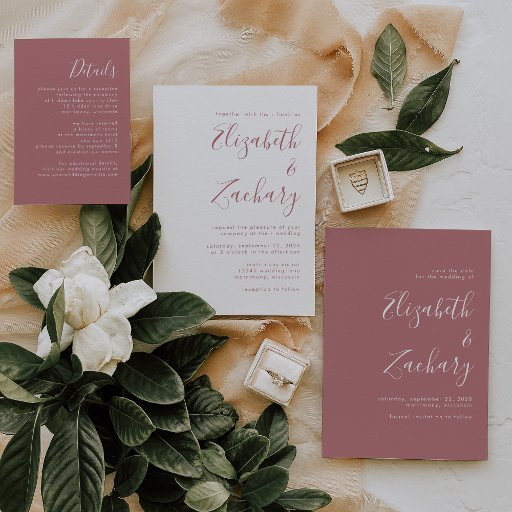 Deze eenvoudige moderne huwelijksuitnodiging bevat witte tekst op een stoffige roos achtergrond. Voeg de namen van de bruid en de groom in stijlvolle handschriftelkalligrafie en de details in sans serif doopvont toe. De achterkant is een overeenkomende schaduw van vast stoffig roos.