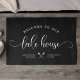 Moderne, chic borstelscript die WELKOM AAN ONZE LAKE HUIS in een trendy typografie gedreven ontwerp leest. Een goed aangepast hok voor je huis, ver van huis. Zowel romantisch als stijlvol, onze zwarte deur heeft een mooie kanoe afbeelding tussen uw locatie en het jaar dat is vastgesteld.