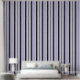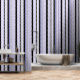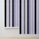 Deze peel en stick wallpaper heeft een zwart, wit en lila paarse gearceerde strepenpatroon.