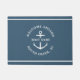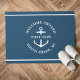 Nautische deurmat in retro stoffig blauw lezen "welkom aan boord" evenals uw aangepaste bootnaam en -locatie.