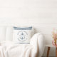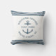 Moderne minimalistische aangepaste bootnaam gooi kussen in stoffig blauw met nautische strepen en anker lezen WELKOM AAN BOORD evenals de naam van jachthaven, dok, jachtclub of stad.