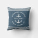 Moderne minimalistische aangepaste bootnaam gooi kussen in stoffig blauw met nautische strepen en anker lezen WELKOM AAN BOORD evenals de naam van jachthaven, dok, jachtclub of stad.