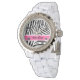 Stijlvolle moderne designer dames polshorloge met een zwart en wit zebra streep patroon met een hete roze naam band die kan worden aangepast aan elke naam aan creëer een unieke gepersonaliseerde dames horloge. Het ontwerp is afgewerkt met wit omlijnde zwarte cijfers