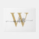 Meisjesachtig moderne elegante stijlvolle witte en gouden monogram initiële naam script aangepaste gepersonaliseerde deurmat. Dit ontwerp toont een voornaam in een mooie met de hand geschreven zwierige staart lettertype kalligrafie (of typografie) met monogram initiaal in goud en zwart op witte achtergrondkleur. Geweldig stijlvol vrouwelijk geschenk voor een huis, ook voor verjaardag, trouwdag, jubileum, pasgetrouwden, bruidsuitstapje, vrijgezellenfeest en het is voor de meid die van schone minimalistische dingen houdt.