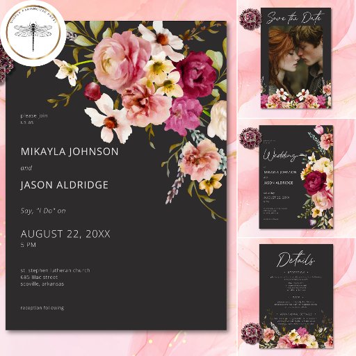 Modern Elegant Summer Meadow Floral Black WeddingOntworpen door Kathe Santillo
