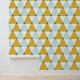 Stijlvol schil- en plakbehang met een geometrisch patroon van mintblauw, goudgeel en witte driehoeken - perfect voor het toevoegen van een moderne touch aan elke kamer.