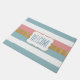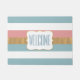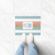 Chique voordeur mat gedaan in een roze, wit blauw en goud gestreept patroon. Een wit decoratief tekstgebied, in het midden van de mat, heeft blauwe tekst klaar om te personaliseren. Wat een leuke manier om gasten bij u thuis te verwelkomen.