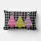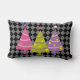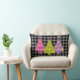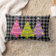 Dit moderne en kleurrijke kussen is voorzien van roze, paarse en groene kerstbomen. De achtergrond is een ingecheckt patroon in zwart en grijs.
