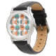 Dit horloge heeft een modern design van halve cirkels in blauwgroen en oranje midden in de eeuw, met de helft van een sterrenbeeld in sommige en kleine herhalende cirkels in andere.
