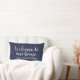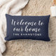 Moderne middernacht blauw en wit "Onthaal aan Ons Huis"lumbar lok kenmerkt stijlvolle manuscripttekst met douane sans serif monogram tekst die met de familienaam kan worden gepersonaliseerd. De stoffen voor binnen- en buitenkussen zijn beschikbaar.