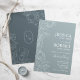 Moderne bloemenbruiloft uitnodiging in blauw grijs leisteen en marine. Eenvoudig stijlvol boho-ontwerp met handgetekende omlijnde botanische accenten, lettertype van het typografische script en monogram aan de achterkant van de kaart. Gedrukte Zazzle-uitnodigingen of direct download digitale afdrukbare sjabloon.