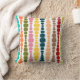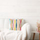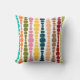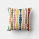 Deze werpkussens hebben een modern design uit de midden van de eeuw van verticale lijnen van afgeronde rechthoeken in toenemende en afnemende grootte in retrokleuren van rood, groen, blauw, geel, oranje, en bruin op een gebied van wit.
