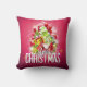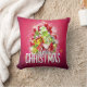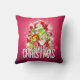 Een kussen met een helder en feestelijk kerst grafisch ontwerp. In de tekst staat Vrolijk Kerstfeest & Gelukkig Nieuwjaar. Ontworpen met een boomvormige heuvel van cadeaus met feestelijke sneeuwvlokken, sterretjes, kerstballen en glowy uitziende glinstertjes. Pijnboomnaalden en boomvormige illustratie ook opgenomen in dit vakantie afbeelding. De achtergrond is een levendige roodachtige roze kleur.