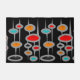 Moderne ruimtedeurmat uit het midden van de eeuw in kleuren van de tijdsperiode op een zwarte achtergrond.