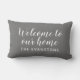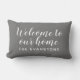 Moderne houtskool grijs en witte "Welkom bij ons thuis" lumboolkussens maken stijlvolle scripttekst met aangepaste sans serif monogram die gepersonaliseerd kan worden met de achternaam van uw familie. De stoffen voor binnen- en buitenkussen zijn beschikbaar.