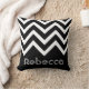 Een helder chevron streepontwerp met een bijpassend massief oppervlak voor het toevoegen van jouw naam, monogram of andere tekst. De achterkant van het kussen is zonder het monogram om u veelzijdigheid te geven in hoe u het kussen weergeeft. Hier weergegeven in zwart-wit, vervang de voorbeeldnaam in de ontwerp-sjabloon met jouw naam en je bent helemaal klaar.