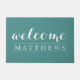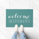 Moderne turquoise en wit "Welkom" kenmerkt stijlvolle manuscripttekst met familienaam.