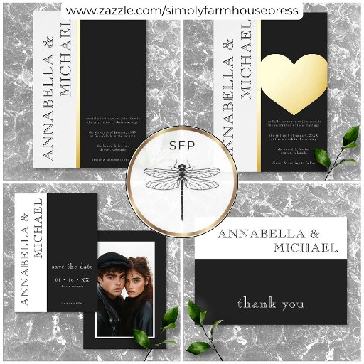 Verhoog uw huwelijksuitnodigingen met ingetogen elegantie. Ons minimalistische ontwerp is voorzien van een opvallend zwart-wit palet geaccentueerd met luxe echte gouden folie, inclusief een boeiend gouden hart als middelpunt. Eenvoudige typografie en strakke lijnen creëer zijn een verfijnde uitnodiging die een blijvende indruk achterlaat op uw gasten. De achterkant benadrukt uw favoriete paren foto. Creëer door Simply Farmhouse Press.