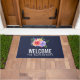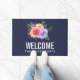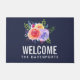 Een welkomstmat gepersonaliseerd met een naam. Ontworpen met een mooi boeket van waterverf rozen met takken, takken en takken allemaal samen in een kleurrijk bloemstuk. Marineblauwe achtergrond.