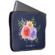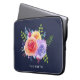 Laptophoes met een mooi boeket van waterverf rozen met sprigs, bladeren en takken samen in een kleurrijke florale constructie. Navy blue background.
