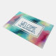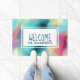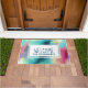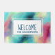 Een welkome matrijs met een cool en stijlvol abstract ontwerp. Waterverven mengen en mengen om de illusie van een afbeelding in de ruimte te creëer. Groen met paars, geel en lichtrood mengsel met witte stippen en sterren. Een coole trippy creatie. Een witte rechthoek gelaagde over bovenkant met het woord "welkom"en jouw naam binnen.