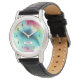 Een horloge met een cool en stijlvol abstract design. Waterverven mengen en mengen om de illusie van een afbeelding in de ruimte te creëer. Groen met paars, geel en lichtrood mengsel met witte stippen en sterren. Een elegante artistieke schepping.