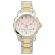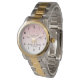 Een eenvoudige en moderne herdenkingshorloge. De achtergrond heeft een afbeelding van mousserende roze druppelaar bovenaan. De rest van de achtergrond is een delicaat pastelroze kleurverloop. 2 gouden trouwbanden boven de gepersonaliseerde tekst.